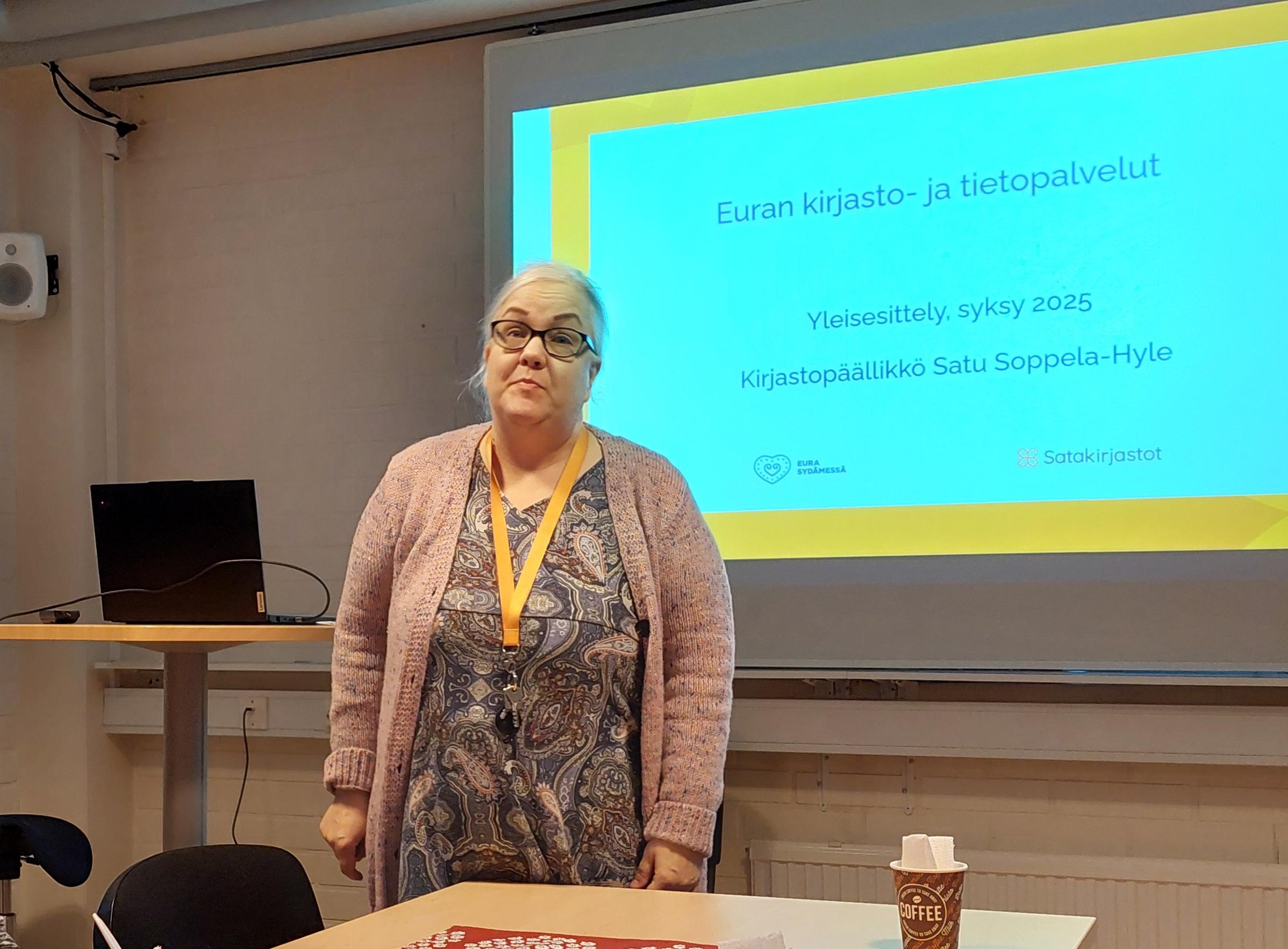 Marraskuun kuukausitapaaminen oli poikkeuksellisesti keskiviikkona 19.11.2025 klo 14-16 Euran kirjastossa. Kirjastopäällikkö Satu Soppela-Hyle esitteli Euran kirjaston toimintaa.